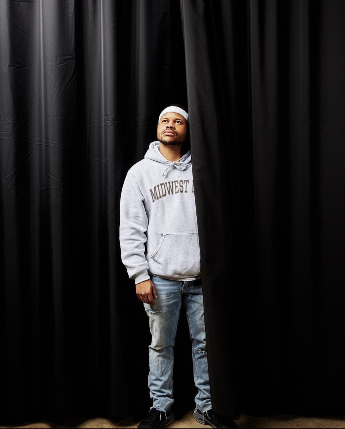 Inside, Holbert, waits for me alone in a booth, coincidentally positioned under a gold light, illuminating just him in the dim lighted bar. Even off the stage, he finds his spotlight. He wears a grey sweatshirt, that says: MIDWEST KIDS and a green beanie with the word LEGEND in bold, both pieces designed by his older brother, Ben. He drinks a Pabst Blue Ribbon beer, speaks confidently and stays engaged. He’s handsomely refreshing. He has a face reminiscent of early 90’s LL Cool J’s dimples and nice smile, it feels polar to most of today’s current rappers bathe-less swagger. It’s hard to ignore his presence; It’s undeniable to feel that you’re within the presence of the next big thing, a well kept secret, itching to fall of someone’s tongue.